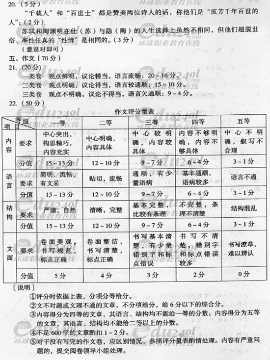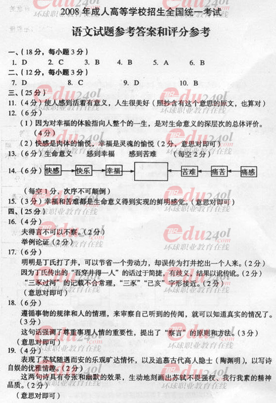 2008年成人高考高起點(diǎn)語(yǔ)文試題答案