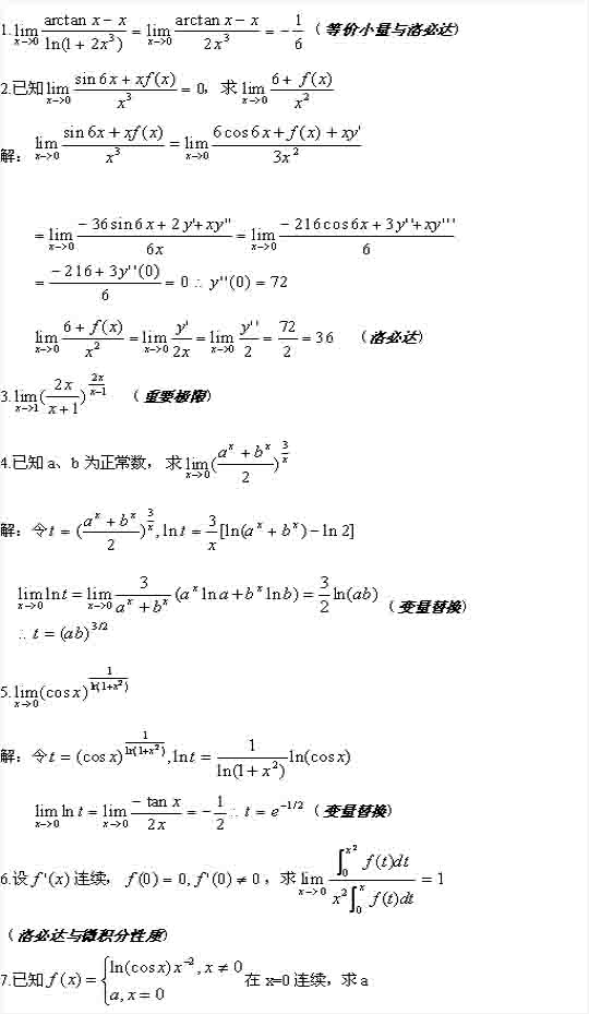 | A.極限的求法 | (1)用定義求 (2)代入法(對連續(xù)函數(shù),可用因式分解或有理化消除零因子) (3)變量替換法 (4)兩個重要極限法 (5)用夾逼定理和單調(diào)有界定理求 (6)等價無窮小量替換法 (7)洛必達法則與Taylor級數(shù)法 (8)其他(微積分性質(zhì),數(shù)列與級數(shù)的性質(zhì)) |
