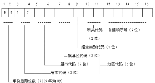 考生號由16位數(shù)字字符組成,前兩位代表年份,接下來的六位是地區(qū)代碼,接著是招生類別和科類代碼,最后五位是順序號,順序號由旗縣區(qū)招生考試機構(gòu)分配,對一個旗縣區(qū)來說順序號范圍為00001―99999,每位考生的順序號不能重復(fù)。