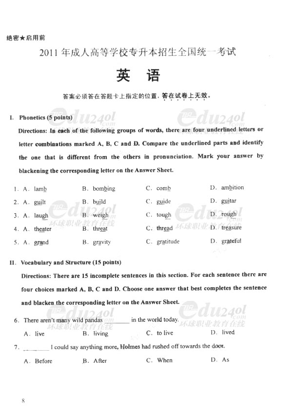 2011年成人高考(專升本)英文試卷及答案