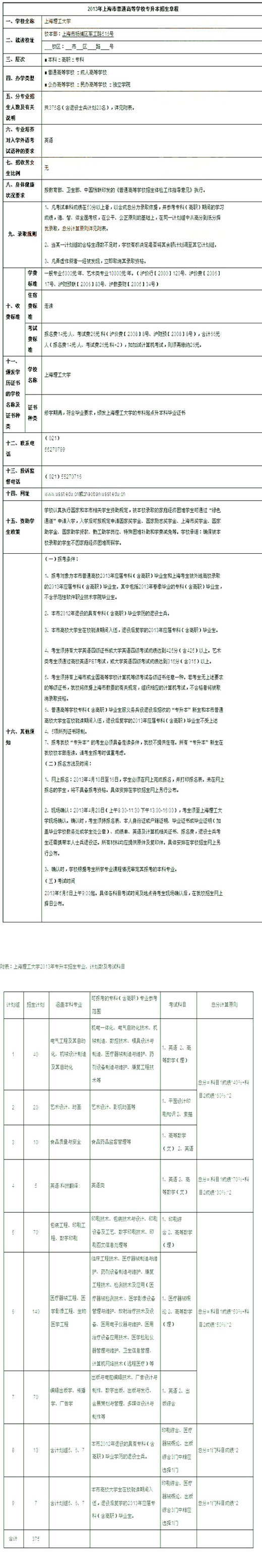 上海理工大學(xué)2013年專升本招生章程