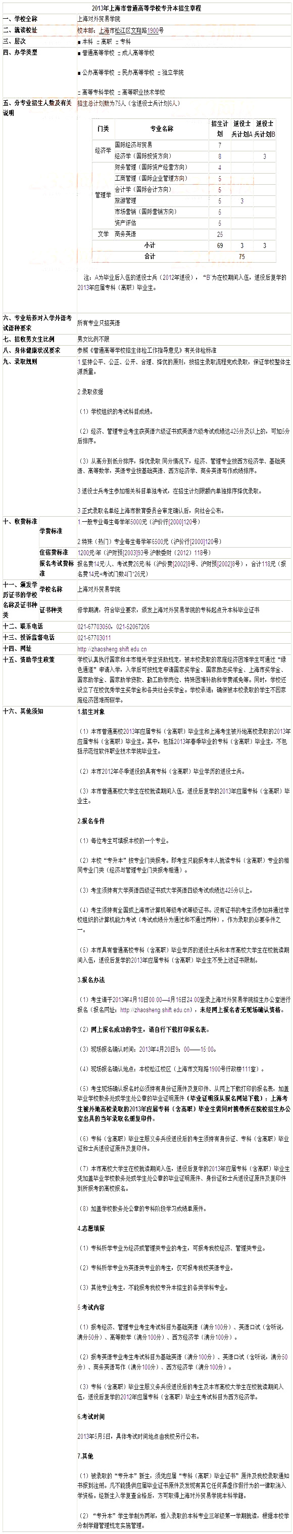 摘要 2013年上海對外貿(mào)易學(xué)院專升本招生章程