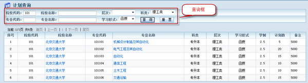 考生可以點(diǎn)擊進(jìn)入查詢相關(guān)的院校和專業(yè)信息,如下圖所示,例如選擇院校為“101”、“理工科類”、“函授”查詢的結(jié)果如下: