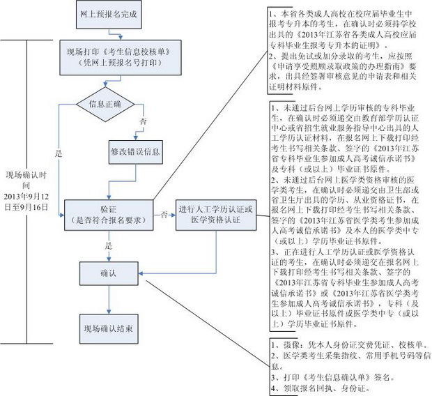 江蘇省2013年成人高考現(xiàn)場確認(rèn)流程圖