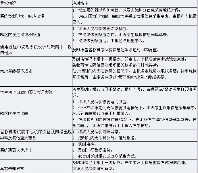 系統(tǒng)在運行過程中,一旦發(fā)生以下各類情況和其他不可預(yù)知的情況,各市州要及時報告我院信息處,由我院啟動相應(yīng)處置措施,各市州、縣市區(qū)及報名點須快速予以響應(yīng)和執(zhí)行。