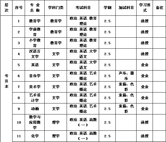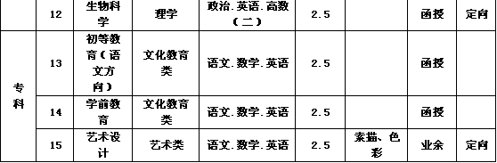 3、藝術(shù)專業(yè)須進(jìn)行術(shù)科加試。其它各專業(yè)不再組織專業(yè)課考試,以成人高考統(tǒng)考分?jǐn)?shù)為錄取依據(jù)。