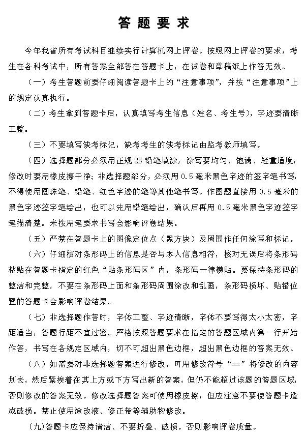 河北省2013年成人高考答題要求及答題卡填涂示例