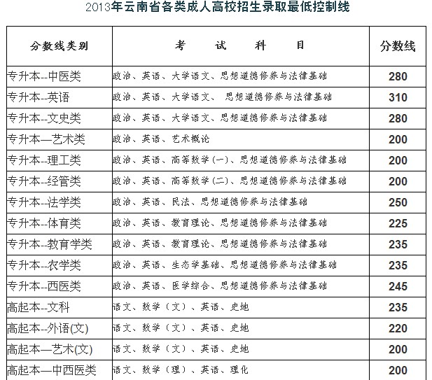 云南省2013年成人高考錄取最低控制線