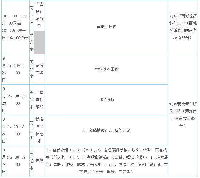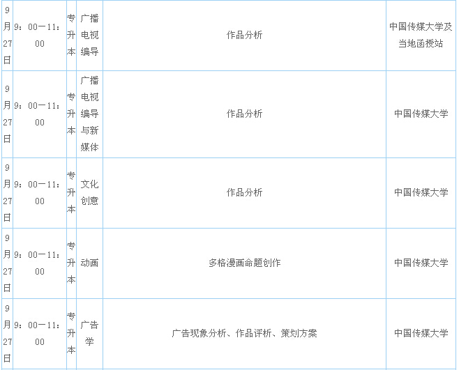 考試時間、地點:文化課考試時間為10月25、26日,按各省、市、自治區(qū)成人高校招生機構(gòu)指定的地點考試,專業(yè)考試按中國傳媒大學遠程與繼續(xù)教育學院規(guī)定的時間及當?shù)氐姆衷?、函授站及教學點指定的地點考試。