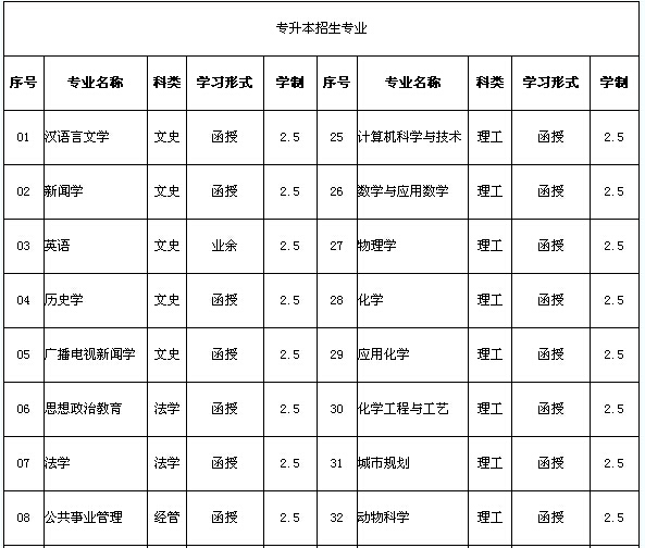 3、??破瘘c升本科:統(tǒng)一考試科目均為三門。兩門公共課為政治、英語,一門專業(yè)基礎課根據(jù)招生專業(yè)所隸屬的學科門類確定。專升本各科類考試科目見下表。