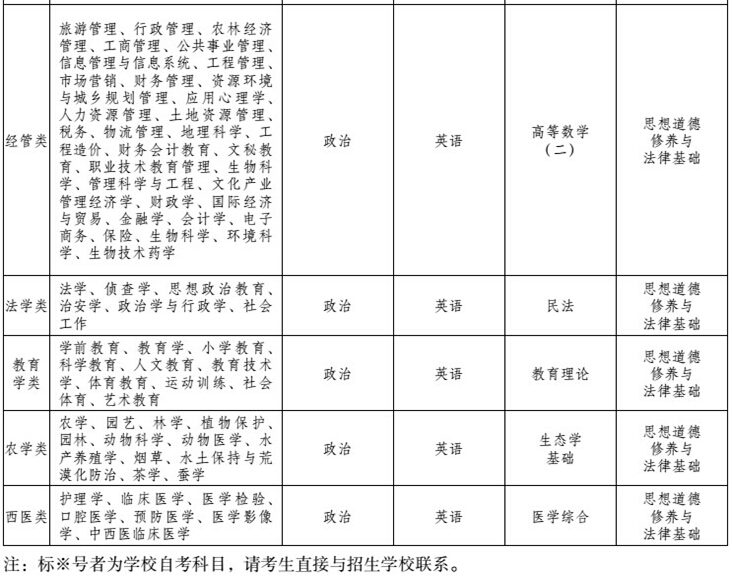 4、經(jīng)管類考試科目為:政治、英語(yǔ)、高等數(shù)學(xué)(二)、思想道德修養(yǎng)與法律基礎(chǔ);