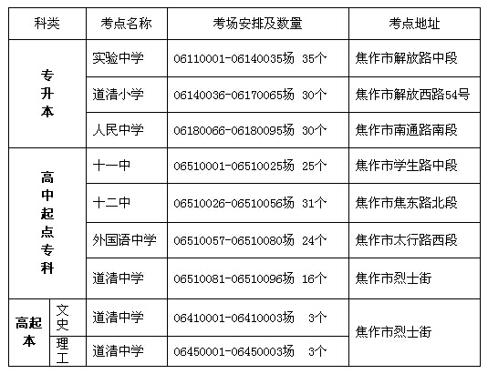 河南焦作市2014年成人高考考點安排