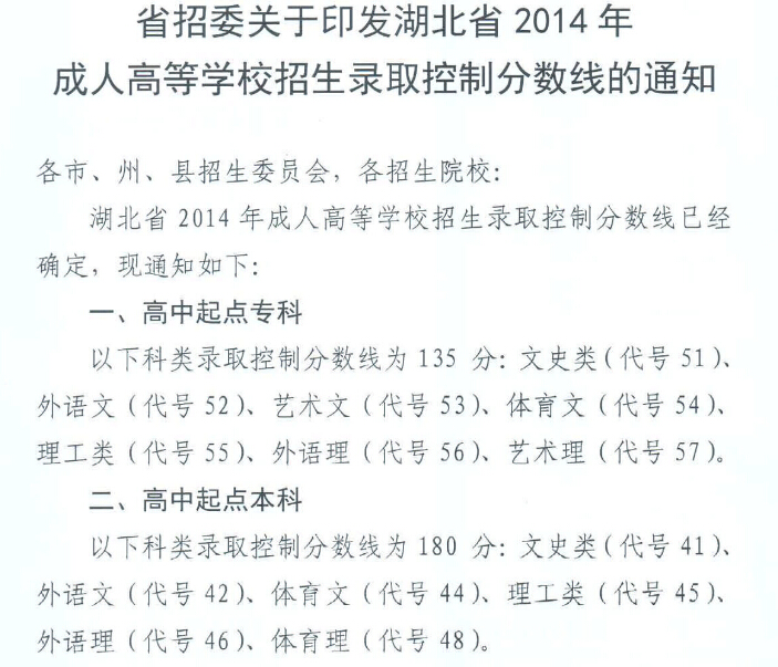 湖北省2014年成人高考招生錄取控制分數(shù)線