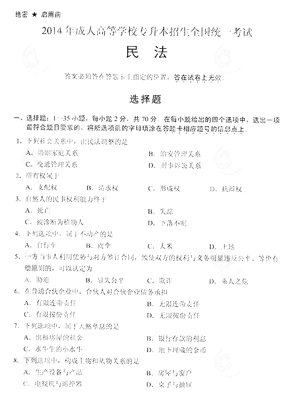 2014年成人高考專升本民法真題