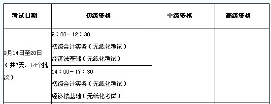 初級會計職稱無紙化考試于9月14-20日舉行;各級別、各科目具體考試時間及批次如下:
