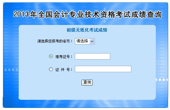 官方2013年初級職稱無紙化考試成績查詢地址:http://60.208.22.51/cjcx/cjcx1.jsp