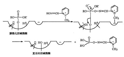 有機(jī)磷酸酯可同乙酰膽堿酯酶的酯解部位發(fā)生親核反應(yīng)形成膦酰化酶,使膽堿酯酶失活。膽堿酯酶復(fù)活劑可水解磷酸酯鍵,重新釋放出活性酶,用于解救有機(jī)磷中毒。