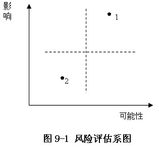 用以評(píng)估風(fēng)險(xiǎn)影響的常見的定性方法是制作風(fēng)險(xiǎn)評(píng)估系圖。風(fēng)險(xiǎn)評(píng)估系圖能識(shí)別某一風(fēng)險(xiǎn)是否會(huì)對(duì)企業(yè)產(chǎn)生重大的影響,并將此結(jié)論與風(fēng)險(xiǎn)發(fā)生的可能性聯(lián)系起來(lái)。這種方法能夠?yàn)榇_定業(yè)務(wù)風(fēng)險(xiǎn)的優(yōu)先次序提供框架。如圖9-1所示,與影響較小且發(fā)生的可能性較低的風(fēng)險(xiǎn)(在圖中的點(diǎn)2)相比,具有重大的影響且發(fā)生的可能性較高的風(fēng)險(xiǎn)(在圖中的點(diǎn)1)更加亟待關(guān)注。每種風(fēng)險(xiǎn)的重大影響程度及影響會(huì)因企業(yè)結(jié)構(gòu)的不同而有所差別。