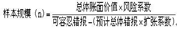 樣本規(guī)模=總體賬面金額(不包括100%檢查)÷可容忍錯報×保證系數