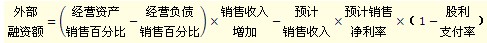 假設(shè)可動用金融資產(chǎn)為0,外部融資額=預(yù)計凈經(jīng)營資產(chǎn)-基期凈經(jīng)營資產(chǎn)-留存收益增加=預(yù)計經(jīng)營資產(chǎn)增加-預(yù)計經(jīng)營負(fù)債增加-留存收益增加=銷售額增加×經(jīng)營資產(chǎn)銷售百分比-銷售額增加×經(jīng)營負(fù)債銷售百分比-預(yù)計銷售收入×預(yù)計銷售凈利率×(1-預(yù)計股利支付率)