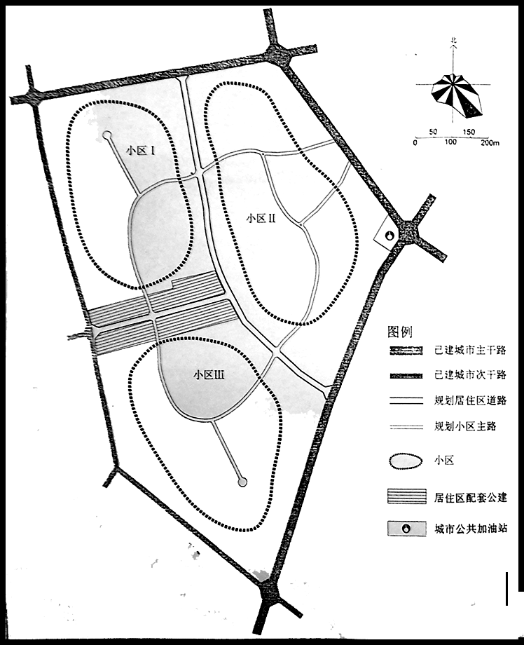 圖為我國(guó)南方近郊的一塊多邊形用地,面積約80公頃,周邊為已建城市主,次干路,按照分區(qū)規(guī)劃的要求,應(yīng)將其規(guī)劃為一個(gè)可容納4.0萬人左右,分設(shè)為三個(gè)居住小區(qū)的居住區(qū),并附設(shè)城市公共加油站一處(用地面積為1200平方米).