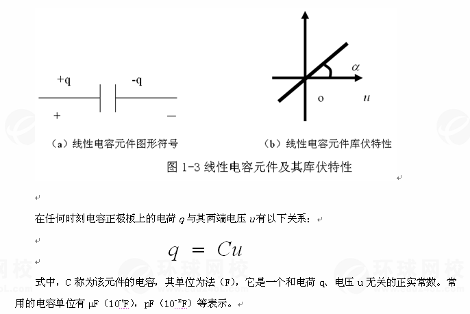 從圖1-3(b)中,可以看出線性電容元件的電荷、電壓關(guān)系在q-u坐標(biāo)軸上,是一條過原點的直線,被稱為電容的庫伏特性。