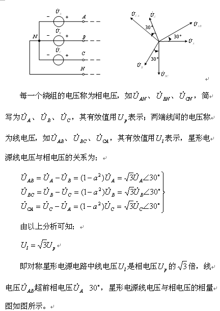圖所示為三相電源的星形聯(lián)接方式。從3個(gè)電壓源正極性端子A、B、C向外引出的導(dǎo)線稱為端線,從中性點(diǎn)引出的導(dǎo)線稱為中性線。