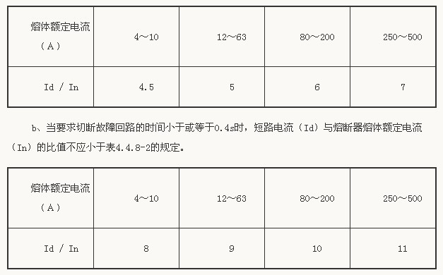 a、當(dāng)要求切斷故障回路的時(shí)間小于或等于5s時(shí),短路電流(Id)與熔斷器熔體額定電流(In)的比值不應(yīng)小于下表的規(guī)定;
