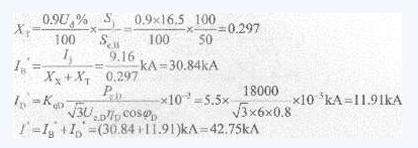 (3)每臺機6.3kV母線分為A、B二段,每段接有6kV電動機總?cè)萘繛?8MW,當母線發(fā)生三相短路時,其短路電流周期分量的起始值為下列哪項數(shù)值?(設系統(tǒng)阻抗為0,KqD取5.5)