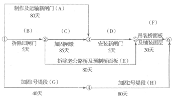 1.施工進(jìn)度計(jì)劃工期為125天;關(guān)鍵工作為B、C、D、F(或拆除舊閘門(mén)、加固閘墩、安裝新閘門(mén)、吊裝橋面及鋪裝面層)。