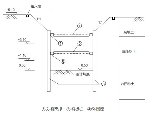 項目部進(jìn)場后立即編制施工組織設(shè)計,擬將表層雜填土放坡挖除后再打設(shè)鋼板樁。設(shè)置兩道水平鋼支撐及型鋼圍檁,溝槽支護(hù)如下圖所示。溝槽擬采用機械開挖至設(shè)計標(biāo)高,清槽后澆筑混凝土基礎(chǔ);混凝土直接從商品混凝土輸送車上卸料到坑底。