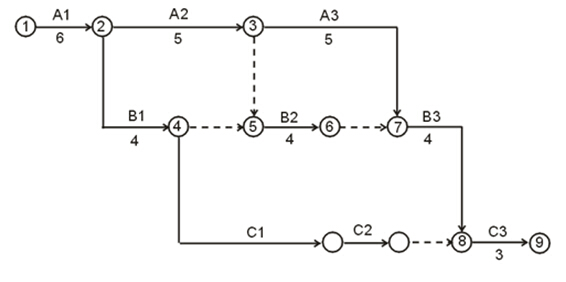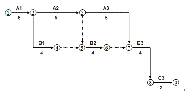 項(xiàng)目部對按上述思路編制的網(wǎng)絡(luò)計(jì)劃圖進(jìn)一步檢查時(shí)發(fā)現(xiàn)有一處錯(cuò)誤:C2工作必須在B2工作完成后,方可施工。經(jīng)調(diào)整后的網(wǎng)絡(luò)計(jì)劃圖由監(jiān)理工程師確認(rèn)滿足合同工期要求,最后在項(xiàng)目施工中實(shí)施。