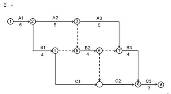 2、發(fā)現(xiàn)C2工作必須在B2工作完成后施工,網(wǎng)絡(luò)計(jì)劃圖應(yīng)如何修改?(請復(fù)制問題1的結(jié)果(網(wǎng)絡(luò)圖)到答題紙上作答。在試卷上作答無效)。