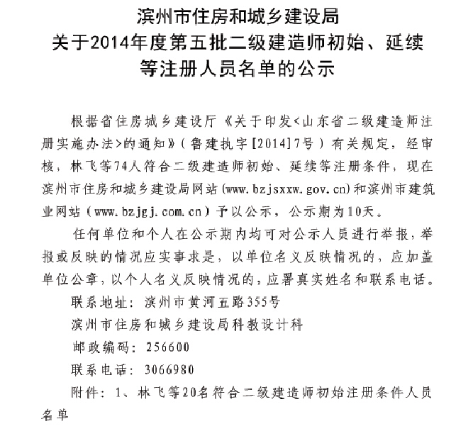 濱州2014年第五批二級建造師初始、延續(xù)等注冊名單
