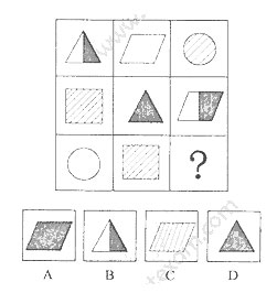 【解答】本題正確答案為D。9個(gè)圖形從上至下從左至右的圖形依次為三角形、平行四邊形、圓形和長方形,且每個(gè)圖形內(nèi)的花紋與其上下左右的圖形全異。故答案為D。
