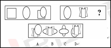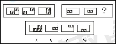 【解析】本題第一組圖形中,第一個圖形中的圓圈順時針旋轉(zhuǎn)120度得第二個圖形,再順時針旋轉(zhuǎn)120度得第三個圖形。依此規(guī)律,在第二組圖形中,第一個圖形的丁字圖形順時針旋轉(zhuǎn)120度得第二個圖形,再順時針旋轉(zhuǎn)120度得出D圖形。