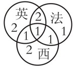 上圖的含義為只懂英語、法語和西班牙語的人數(shù)分別人2、1和2,共5人,而一種語言都不會(huì)說的人數(shù)為12-(2+2+1+1+1+1+2)=2(人),5-2=3(人)。