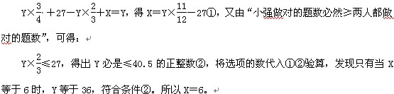 【解析】D。設(shè)都沒做完的題目共有X道,題目總數(shù)為Y道,則“小明做對(duì)的+小強(qiáng)做對(duì)的-他倆都做對(duì)的+他倆都做錯(cuò)的=總題數(shù)”,即: