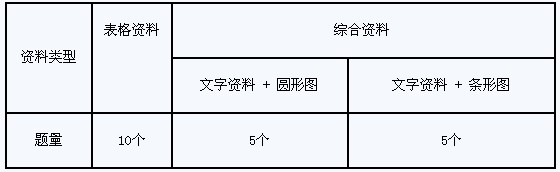 資料分析題目設置按照難易程度可以分為三種:查找題、計算題和綜合分析題。查找題是通過對資料的觀察就可直接得出答案的題目。查找題屬于簡單題,它在整個資料分析中占的比重大約在20%。計算題是需要經(jīng)過一定的運算方可得出答案的題目,計算題屬于中檔題,它在整個資料分析中占的比重大約在50%~60%。綜合分析題是具有一定綜合性的題目,憑直觀和簡單的計算不能得出結(jié)論,需要對材料進行總體分析和概括。綜合分析題屬于高檔題,它在整個資料分析中占的比重大約在20%~30%。