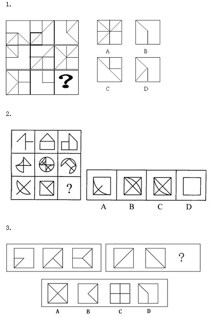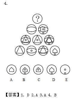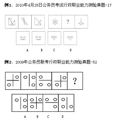 【解析】這兩題雖然形式不同,但有一點(diǎn),圖形的組成很相似。相似圖形間是怎樣變化的?很容易發(fā)現(xiàn),前兩個圖疊加,相同的部分消去,不同的部分保留,也就是去同存異。但2010年2010年4月25日公務(wù)員考試17題比2009年公務(wù)員聯(lián)考的52題更容易判斷推理路線,這兩題的答案都是A。