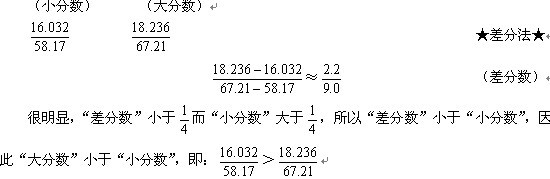 【注】 上面運用的“差分法”具體解題原理可參見下文“‘差分法’使用基本準(zhǔn)則”。在計算“差分?jǐn)?shù)”的時候,在不影響計算精度的前提下,我們簡單的將分子、分母的差取小數(shù)點后1位,這樣的方法稱為“截位法”;在比較“差分?jǐn)?shù)”與“小分?jǐn)?shù)”大小關(guān)系時,我們運用了前面講過的“插值法”。