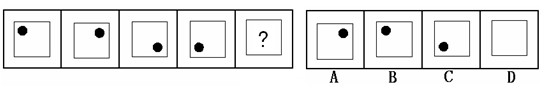 (答案:B。黑點在正方形中順時針移動。在第5個圖形中,應(yīng)該正好移動到左上角。)