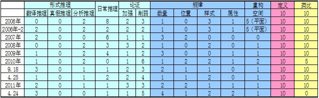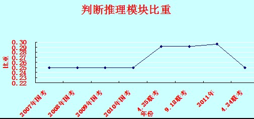 從上圖可以分析出:判斷推理模塊在2010年的考試中有所上升,從以前的0.25上升到0.3,雖然剛剛不久的424聯(lián)考中考察比重又回到0.25,但是比重上升的趨勢不可忽視。