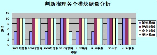 從上圖分析可知,圖形推理:2007-2009年5道題,但從2010年一直上升至10道;邏輯判斷、定義判斷:一直是10道題目沒有改變;類比推理:之前大部分都是10道題目,但是近來的424聯(lián)考卻取消了這個模塊的考查??傊瑘D形推理模塊的比重有所增加,邏輯判斷、定義判斷保持不變,類比推理有所下降。