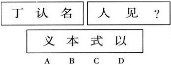 解析:本題目考察求異??疾烨笸乜疾烨螽?前面一組圖形中第一個與第二個圖形不同元素是:“之”“云”,這兩個元素組合后正好是第三個圖形;后面一組圖形,前面兩個圖形的不同元素是“口”“人”,組合成第三個圖形,因此選B;