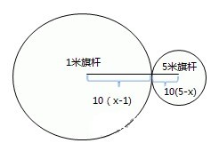 【老師作答】C。旗桿的高度最高為5,最小為1。因此這兩個(gè)旗桿間的距離不超過(5-1)×10=40米?紤]其余旗桿的位置分布,設(shè)任意旗桿高度為x。要滿足與1米旗桿間距離不超過它們高度差的10倍,應(yīng)在下圖左邊的圓范圍內(nèi)。要滿足與5米旗桿間距離不超過它們高度差的10倍,應(yīng)在下圖右邊的圓范圍內(nèi)。同時(shí)滿足條件的旗桿只能位于兩個(gè)旗桿的連線上。所以滿足條件的旗桿都位于一條直線上,最少需要40×2=80米即可把它們都圍進(jìn)去。