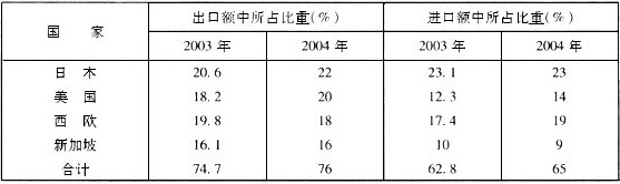 2003-2004年日本、美國、新加坡及西歐國家在馬來西亞進(jìn)、出口貿(mào)易額的比較