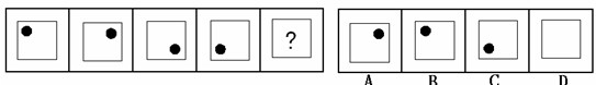 (答案:B。黑點在正方形中順時針移動。在第5個圖形中,應該正好移動到左上角。)