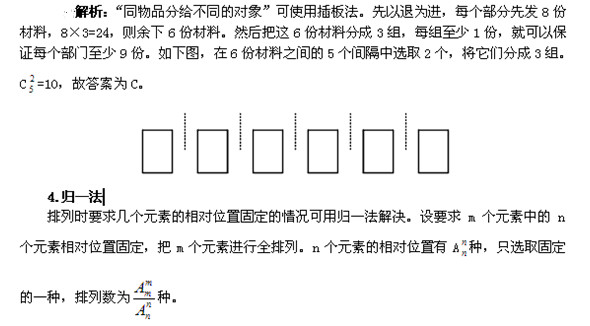 若要求把n個(gè)元素分成m堆(每堆至少有1個(gè)),則把(m-1)個(gè)木板插入這n個(gè)元素形成的(n-1)個(gè)“空隙”中去可實(shí)現(xiàn)上述要求【例題6】某單位訂閱了30份學(xué)習(xí)材料發(fā)放給3個(gè)部門,每個(gè)部門至少發(fā)放9份材料。問(wèn)一共有多少種不同的發(fā)放方法?