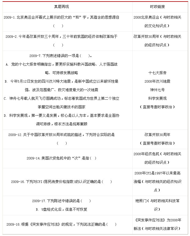 經(jīng)過對國考題、省考、聯(lián)考的分析,發(fā)現(xiàn)國考每年都會側重對幾個專題的考查,這幾個專題基本都是關系國計民生的:十七大、民族政策和民族關系、成就(科技成就、政治成就、經(jīng)濟成就、體育成就等,一般可以出兩個題)、能源、區(qū)域經(jīng)濟政策、航空航天。